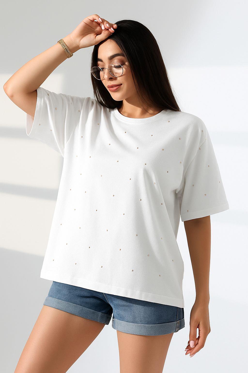 • %100 Pamuk kumaştan, kayık yaka taşlı t-shirt