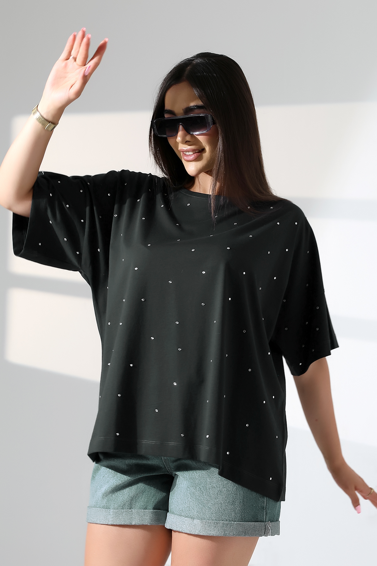 SİYAH TAŞLI KAYIK YAKA T-SHIRT | curly