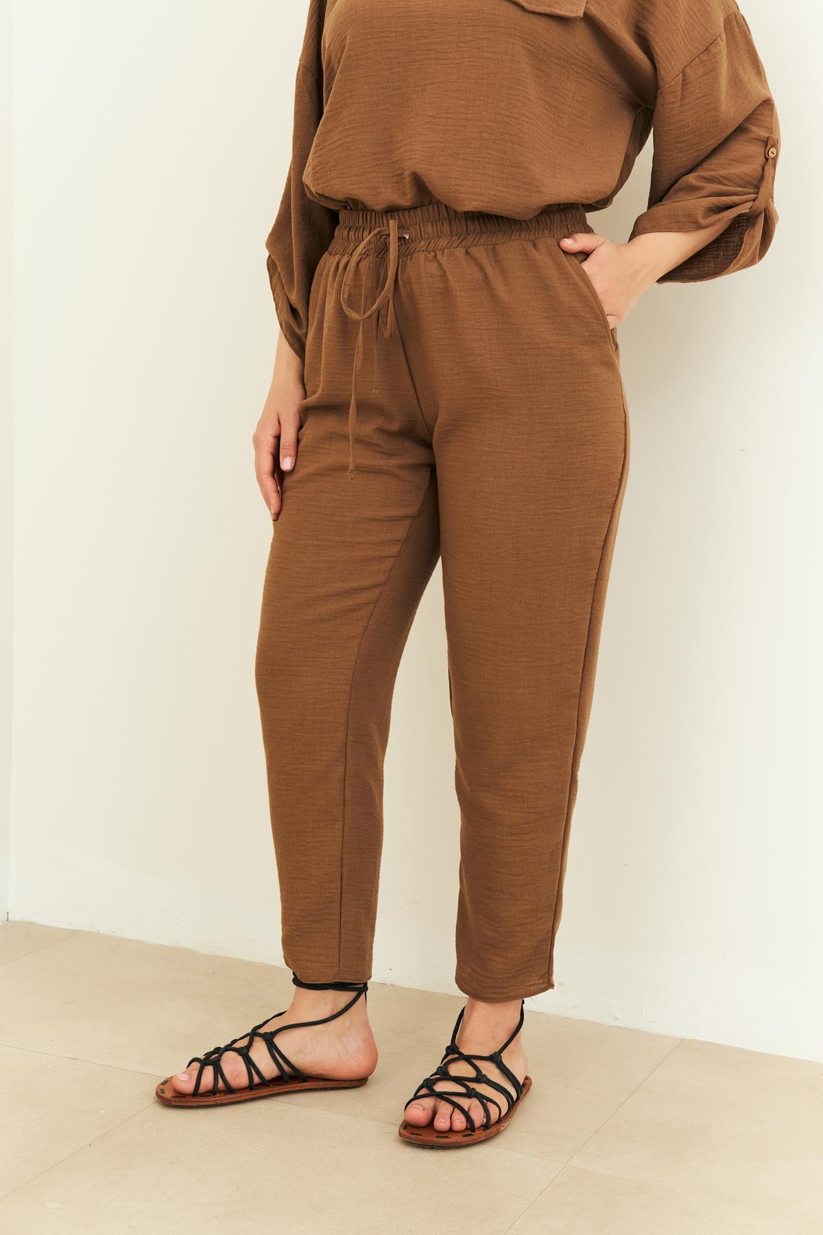 TOPRAK RENGİ BAĞCIKLI KETEN PANTOLON