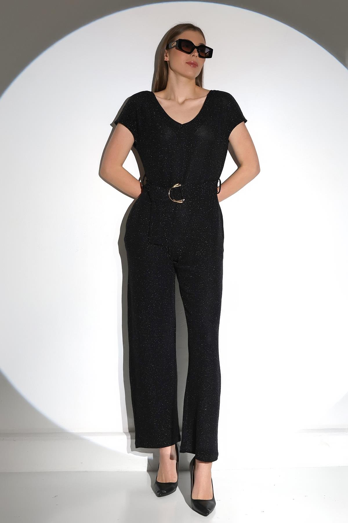• Örme simli kumaştan, v yaka beli kuşaklı tulum